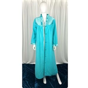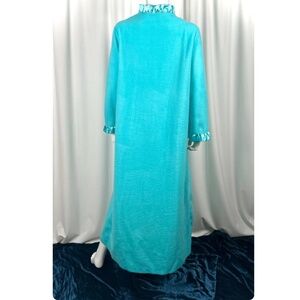 Vintage 1960’s 1970’s Long Fuzzy House Coat in Day Glow Teal Blue Green • Satin Quilting • Pearl Buttons • Ruffle Collar + Trim • Maxi