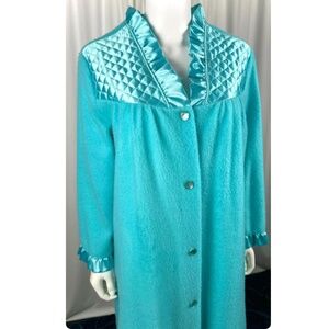 Vintage 60’s 70’s Long Fuzzy House Coat in Teal Blue Green • Satin Quilted - M/L