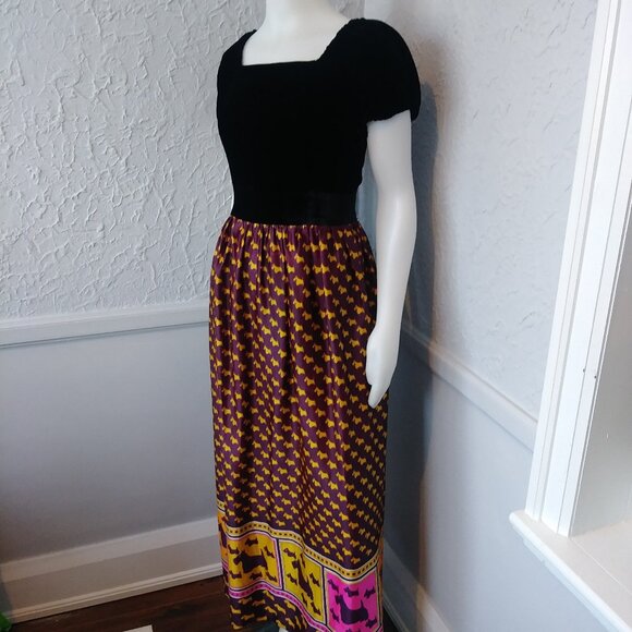 Vintage 60's 70's Maxi Dress by The House of Nu-Mode - black velvet top bodice