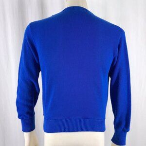 1960s - 70s blue cardigan sweater. Bright blue panel at each side trimmed in blue braided pieces. Unlined, button front with ribbed waistband and cuffs and buttons at sides. National Shirt Shops label, 100% acrylic. Marked a size M BUT Please go by measurements below as vintage sizes can differ.