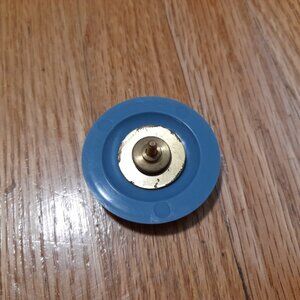 Good used vintage condition with some tarnishing and scuffs. The plastic disc is light blue.