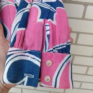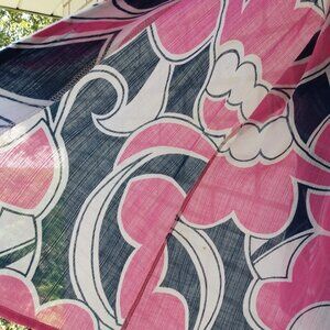 Fabric feels like a cotton blend or maybe rayon. It is lightweight and somewhat sheer.