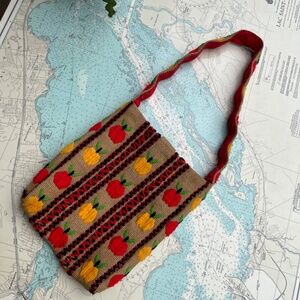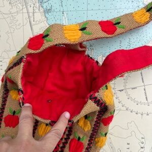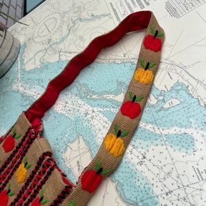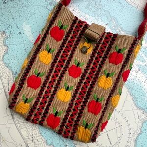 Vintage 60s / 70s handmade apple embroidered burlap shoulder bag. Fantastic retro piece! Lined, with detailed strap and overall style fastener. Bag measures approx. 11.5" x 9.5".