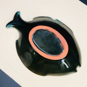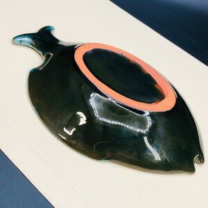 Vintage 60s Art Pottery Fish Trinket Dish Red Clay Aqua Green Drip Glaze