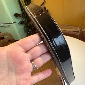 It has a black and white abstract houndstooth style print, making it look like grey, a vinyl black strip around the zipper, giving a faux patent leather look; shape is asymmetrical, inside is golden bronze vinyl with an elastic pocket on the top part.