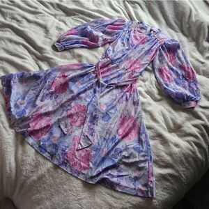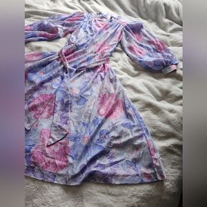 Vintage 60s Dress Pastel Floral Cirlcle Skirt Midi Cottagecore Puff Pleated Slee