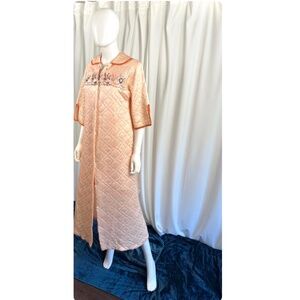 Vintage 1960’s Elegant Lady Montreal Long Quilted Bed Jacket Coat • Pastel Sherbet Orange • Floral Embroidery • Pearl Buttons • Collared