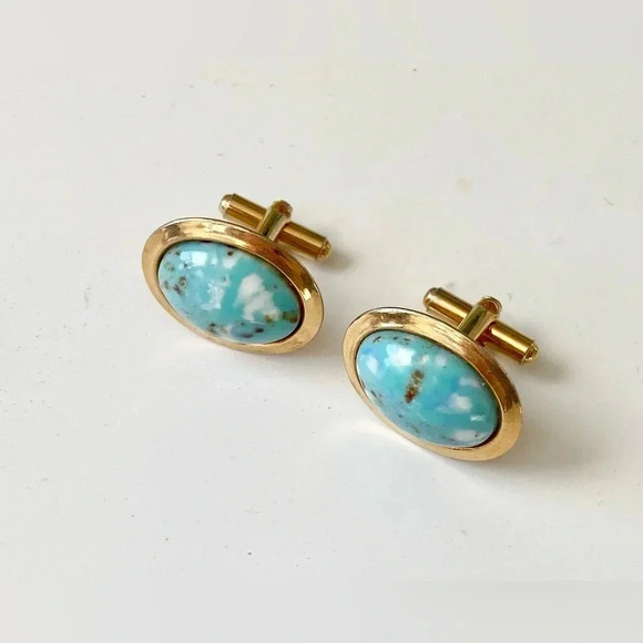 Vintage 1960s Faux Turquoise Blue Glass Oval Goldtone Cufflinks.