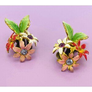 Vintage 60s Flower earrings, Austria painted enamel gold tone, clip on