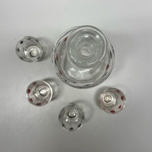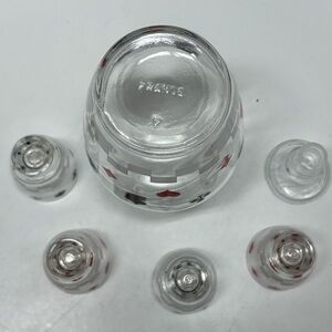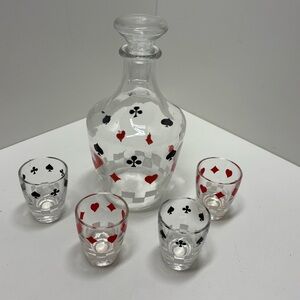 Vintage midcentury French glass decanter and 4 shot glasses with playing card theme. Includes 6 pieces in all with the decanter lid. All pieces are in excellent preowned condition with no cracks, chips or paint damage. Features a design with hearts, diamonds, clubs and spades. Use this on your next game night!