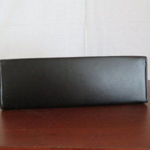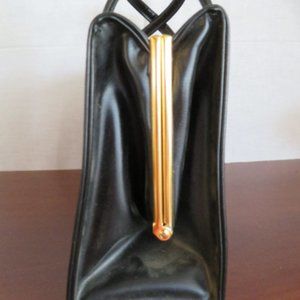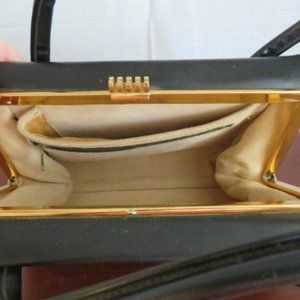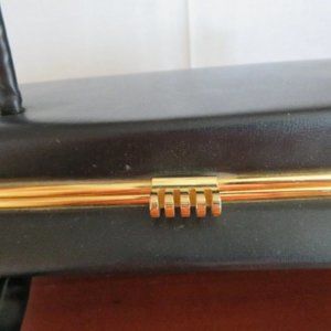 Vintage black hardshell handbag, with two top handles and gold tone hardware. Roll-top clasp. The exterior feels like leather, but there are no labels. Interior is suede leather, with one pocket, has a zipper on the front to make a coin pocket.
