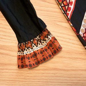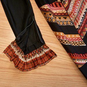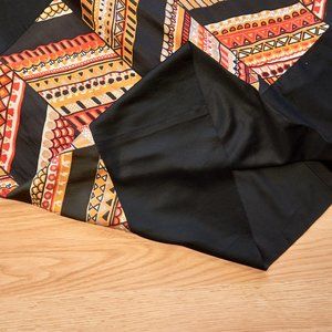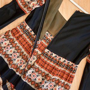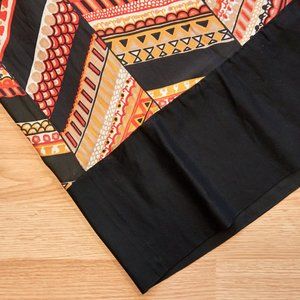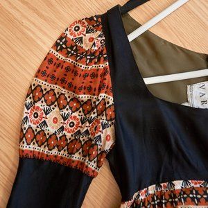 Made of a smooth finished nylon jersey it is a good wearable lightweight. It has that classic sixties pattern and color with an almost chaotic feel that Varon manages to make work. The colors have held up perfectly and they have stood the test of time, staying true and crisp. The dress has a square collar and a sleek bodice. The sleeves are cut long and lean with a killer bell finish to each cuff. The skirt to the floor and a band of black to anchor the piece. The nylon jersey is easy to wear and it will travels fabulously.