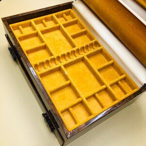 Vintage 60s Jewelry Chest Dresser Box with Drawer: Brown Vinyl Orange Lining