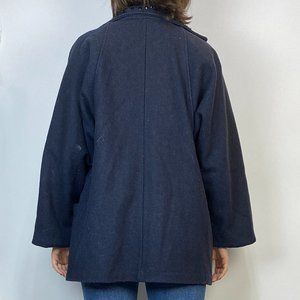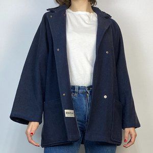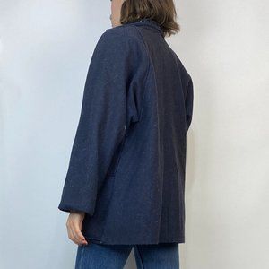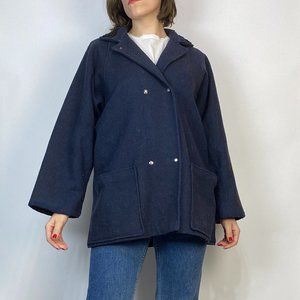 Vintage 60s wool navy coat with swingy minimal cut, super cute double breasted snap buttons and beaded collar! Fabric is a bit faded and a bit worn with some piling but it gives it a nice vintage look. By Irving Posluns, Made in Canada. About a medium.