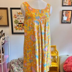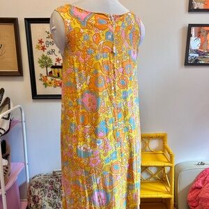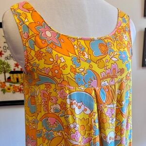 Add a groovy pop of color to your wardrobe with this authentic 1960s vintage swing dress! Featuring a bold, psychedelic floral print in vibrant yellow, pink, orange, and blue, this sleeveless mod dress brings the perfect dose of retro fun. The easy, flowing A-line silhouette and lightweight fabric make it super comfortable and ideal for summer festivals, everyday wear, or layering year-round.