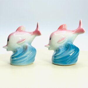 60s Kitsch Anthropomorphic Pink Dolphin on Blue Wave Salt Pepper Shaker Set