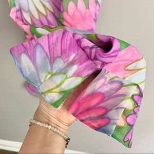 Shades of pink, purple, white, & green. Material is a lined, nylon chiffon/polyester.