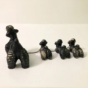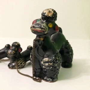 Vintage 60s Redware Poodle Family Set Mom Pups Black White on Chains Japan Flaws