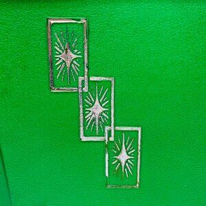 Cool 60s Sterilite Green Textured Plastic Trash Can with a Triple Silver Starburst Medallion motif.
