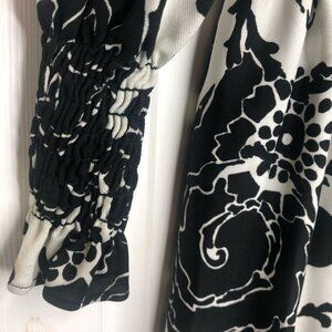 Vintage dress with union label. Missing size & fabric tag. Empire waist. Slightly elasticized waist and cuffs on the sleeve. Pretty floral pattern. Zips up in the middle of back. Ties up in the back. Amazing vintage condition. Sizing is approximate. Waist 11” Sleeves 21” Shoulder to top of waistband 10.5” shoulder 13.5 Waistband to hem 39” Pit to pit 16.5”