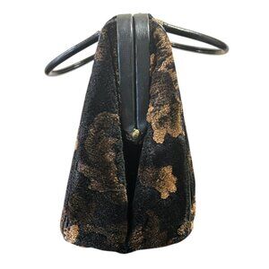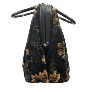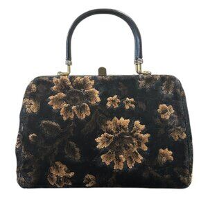Elegant vintage 1960s Verdi floral tapestry purse featuring rich black and brown woven florals with gold-tone hardware and a vinyl-wrapped wood handle. Made in the USA, this handbag embodies the classic carpet bag style reminiscent of vintage doctor’s bags.