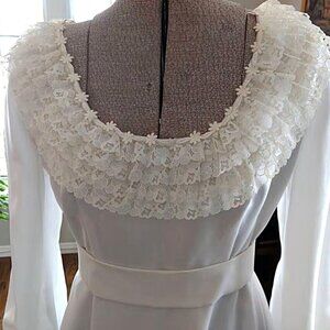 The scoop neckline is decorated with rows of cream ruffled lace and a daisy chain trim.