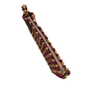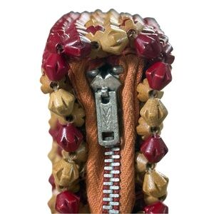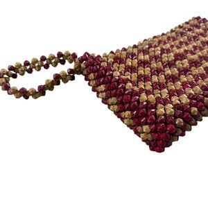 Vintage 1960s wristlet clutch made from red and tan wooden beads with a matching beaded strap. Features a structured silhouette, satin-lined interior and a sturdy metal zipper with a stamped pull. A striking and tactile piece that captures the charm of mid-century design.