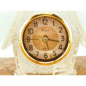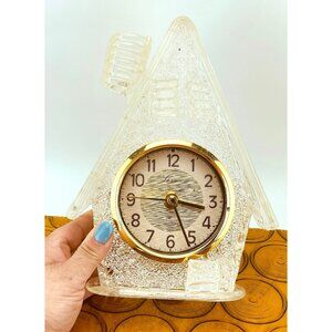 Stunning vintage 60s spaghetti spun lucite clock. Made in Japan, shaped as a cottage.