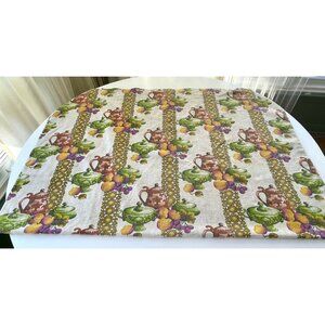 beige with vertical pattern of fruits and kitchenware, colors are yellow, green, purple, orange.