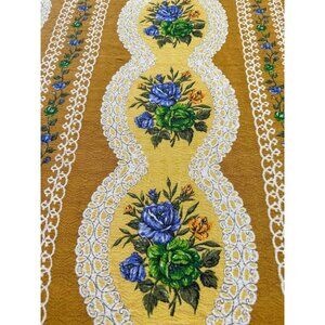 Large and bright cabbage roses flowers pattern, in purple/blue and green, over yellow and golden orange background. Panel is not lined.