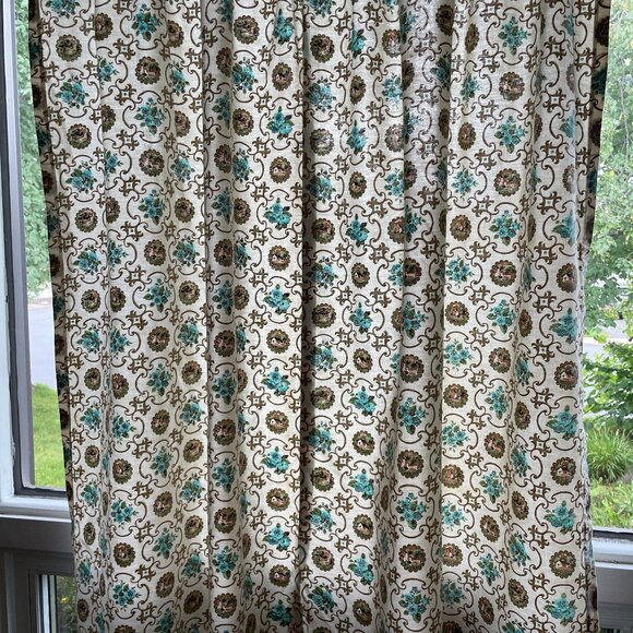 Stunning MCM medallion and floral pattern, gold and teal, price is for one pleated panel or a pair of rod heading. this listing is for the pleated one. See other listing for the pair.