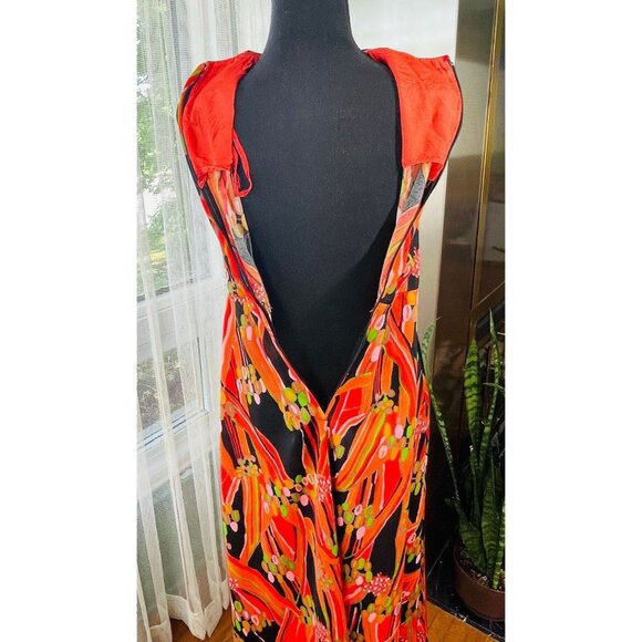 Fabulous 1960s maxi sheath dress, in bold orange, yellow, green, pink, red and black abstract pattern. Crew collar, decorative buttons on one shoulder. Ankle length, zips on the back. No label, likely handmade.