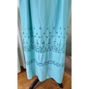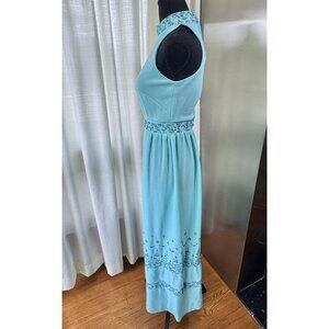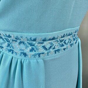 Fabulous 60s vintage maxi dress. Thick textured knit in an aqua blue color, this gown has a halter neckline, going into a mock turtleneck. It also has very intricate folk-style cross-stitch embroidered details at the neck, the waist and the bottom of the skirt. It flows into a long A-line skirt, ankle length. Zips from the back, it has a clean minimalist silhouette, very retro and perfect for a formal event.