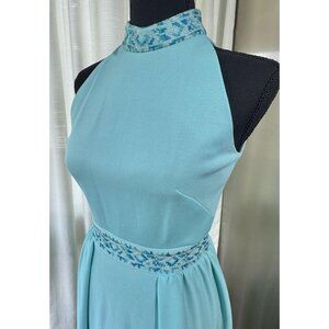 Vintage 60s dress, aqua blue, high halter neckline, sleeveless cocktail gown