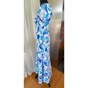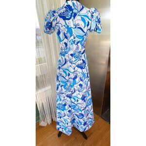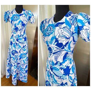 Fabulous 1960s maxi dress, in bold blue tropical flowers pattern. Crew collar, puffy balloon short sleeves. Ankle length, zips on the back. No label, likely handmade. Material is likely polyester or synthetic blend, feels like polyester.