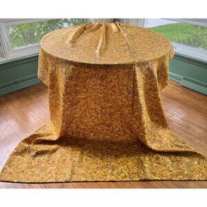 The print is very abstract and groovy in orange, yellow, brown and avocado green.