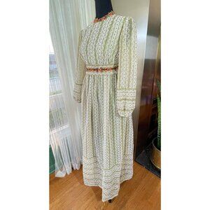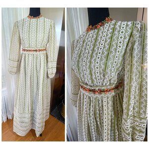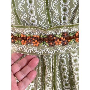 Such a rare find! vintage late 60s organza flocked prairie maxi dress, in celery green with white flocked flowers and orange, brown and green embroidered waist and collar.