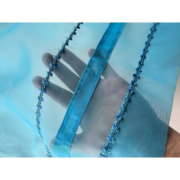 Vintage 60s sheer curtains, Robin Egg blue, embroidered trim, pair
