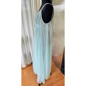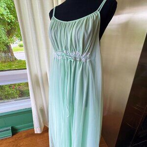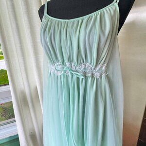 Stunning vintage 60s double layered nightgown. Color is light mint green, the empire waist has lace details and a drawstring tie that is attached to the inside layer; it gives a nice cinched fitted waist. Double spaghetti straps, ankle length. Made in Canada by Linda Underlovelies. Fabric is unknown, likely synthetic blend, nylon or acetate.