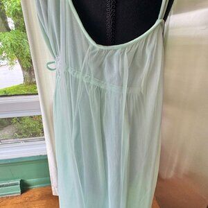 Vintage 60s slip on negligee, mint green, cinched empire waist, lace & ribbons