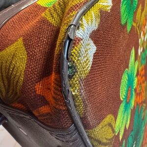 Made in Japan, this case has a vibrant floral print in brown, orange and green, with a cream vinyl interior. It has a front zipped pocket, straps inside. The zipper attaches to a small locking part, unfortunately no keys.