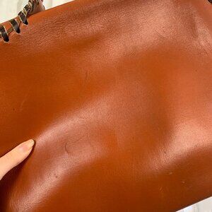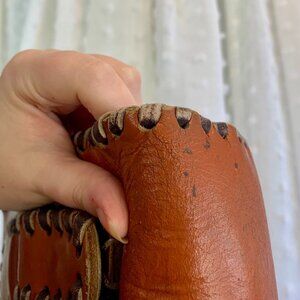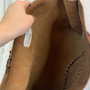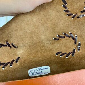 Step back in time with this vintage 70s leather octagonal satchel. Featuring a stylish, eye-catching woven leather detailing along the edges and an edgy octagonal shape, this bag is perfect for the modern vintage lover. A perfect time capsule pieces from the hippie and counterculture era. The medium weight, supple leather exudes quality and has held up well over the years, with only light wear on the edges and a few minor marks on the back. Made by the coveted brand "Creations Goeleand" in Canada, this satchel is sure to become a standout piece in your vintage accessory collection.