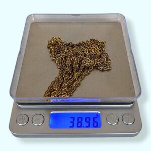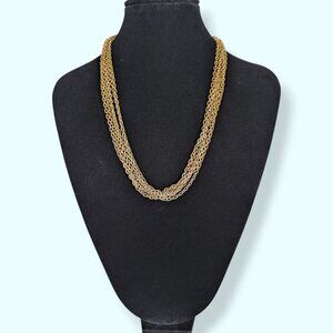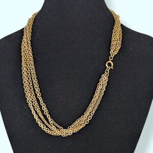 This vintage 6-strand necklace is made of gold tone metal and has a c clasp closure. The strands are all made of small, standard chains and are fairly similar in length; I didn't twist the chains like a torsade in the pictures, but it would probably look cool. The necklace has wear throughout, including some tone change and silvering in the metal, but it's still wearable.