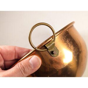 Vintage Coppercraft Guild copper mixing bowl with large copper thumb ring or hanging ring, the bottom flat so it stand sturdy on any flat surface. The outside with marks of age and use, and some scuffing to the bottom edges. The inside with age-related discoloration and some staining as can be seen in the photos.