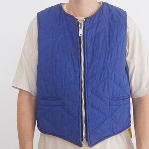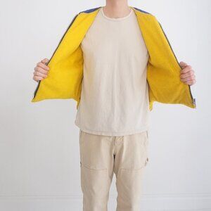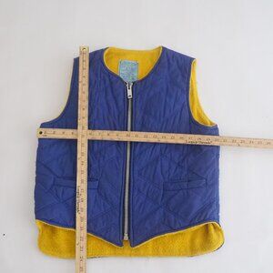 Vintage '70s Rare Quilted Blue with Yellow Teddy Bear Liner Zip-Up Jacket Vest. This unique and hard-to-find piece features a vibrant quilted blue exterior with a cozy and playful yellow teddy bear print liner. Designed for both warmth and style, it can be worn as a standalone vest or layered for a classic retro look. The zip-up front adds functionality, making it a versatile addition to any vintage collection.