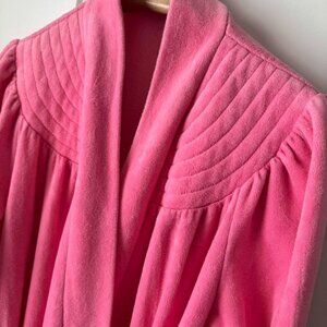 Made from a plush and luxurious velour fabric, this robe feels as good as it looks. The vibrant pink color is a total showstopper, and the elegant pleated detailing on the shoulders adds a touch of old Hollywood glamour. Perfect for lounging in style, getting ready for a night out, or even wearing as a statement duster jacket. It’s in incredible condition for its age. A rare and beautiful find!