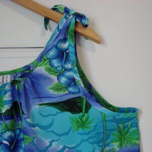 - beautiful tropical hawaiian print loose fit dress features colours of blues, greens, purple and white