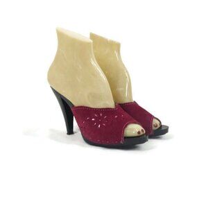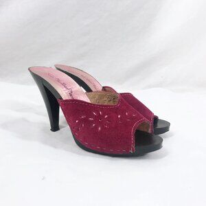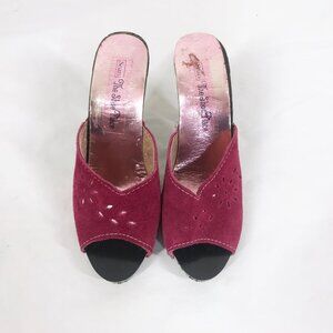 Vintage late 70s- early 80s Sears maroon suede with cutouts and metallic pink mules. Sears the Shoe Place label in polyester backing to suede. Black molded plastic soles (Made in Italy) with rubber pads and marked a size 37 BUT Please read measurements and condition below before purchase. Very much like vintage Candies.