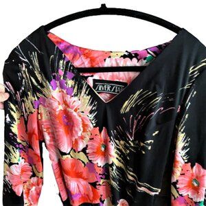 Vibrant vintage (1970s) boho dress By Silver Star No size tag but most likely a contemporary medium (please see measurements) Black with vibrant floral print in pinks, purples and tans Long sleeves A line V neck Removable rope belt in black Zipper on the side Approximate measurements: shoulder to shoulder: 15 . 1/2", armpit to armpit: 18", across waist: 13 1/2", length: 55" Excellent condition 2043