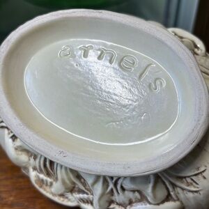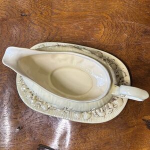 Vintage 70s Arnels Merry Mushrooms large ceramic gravy boat with saucer. I love the finish on this one- it’s an cream shade accented with dark brown to give it an antiqued look. It’s in excellent preowned condition with no damage or signs of wear. This gravy boat is a larger size that would be perfect for family dinners around holidays.